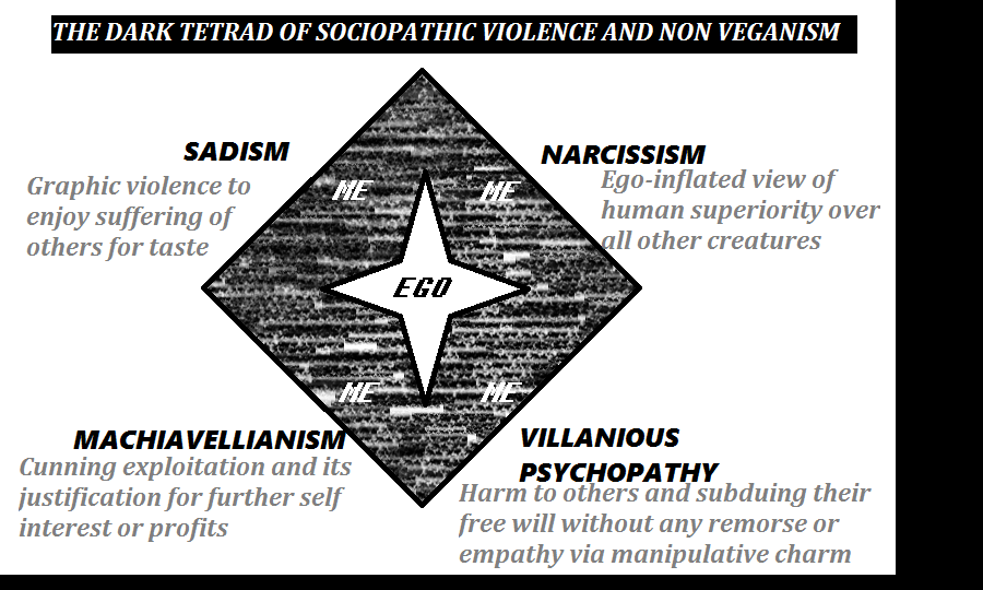 From my own personal reflections with several non vegans and vegetarians or plant based people who sometimes misidentify as vegan, there are plenty of parallelisms between Psychopathy, Narcissism and Machiavellianism (the ominious Dark Triad) along with the fourth dimension of Sadism (Completing the Dark Tetrad). Here are the most obvious signs of this complex Dark Tetrad prevalent among masses who are sociopathically brainwashed by a severely human-centric worldview in culture.