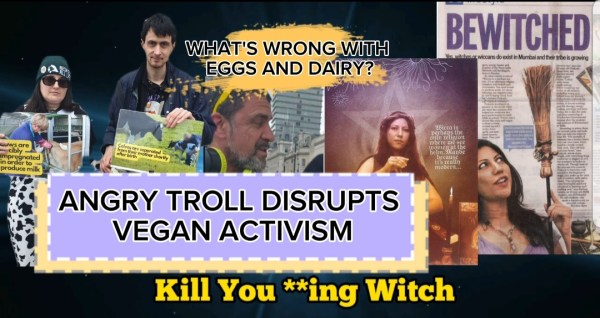 Watch how rude Iskcon Hare Krishna priest hits vegan activist reporter at a small dairy protest, when was recording event on the phone. Iskcon is well known for misogyny, with founder Prabhupada stating that women enjoy rape, and that blacks should still be slaves. Maa Ka Doodh documentary film exposes their Ahimsa milk gimmick with Menaka Gandhi speaking against them.